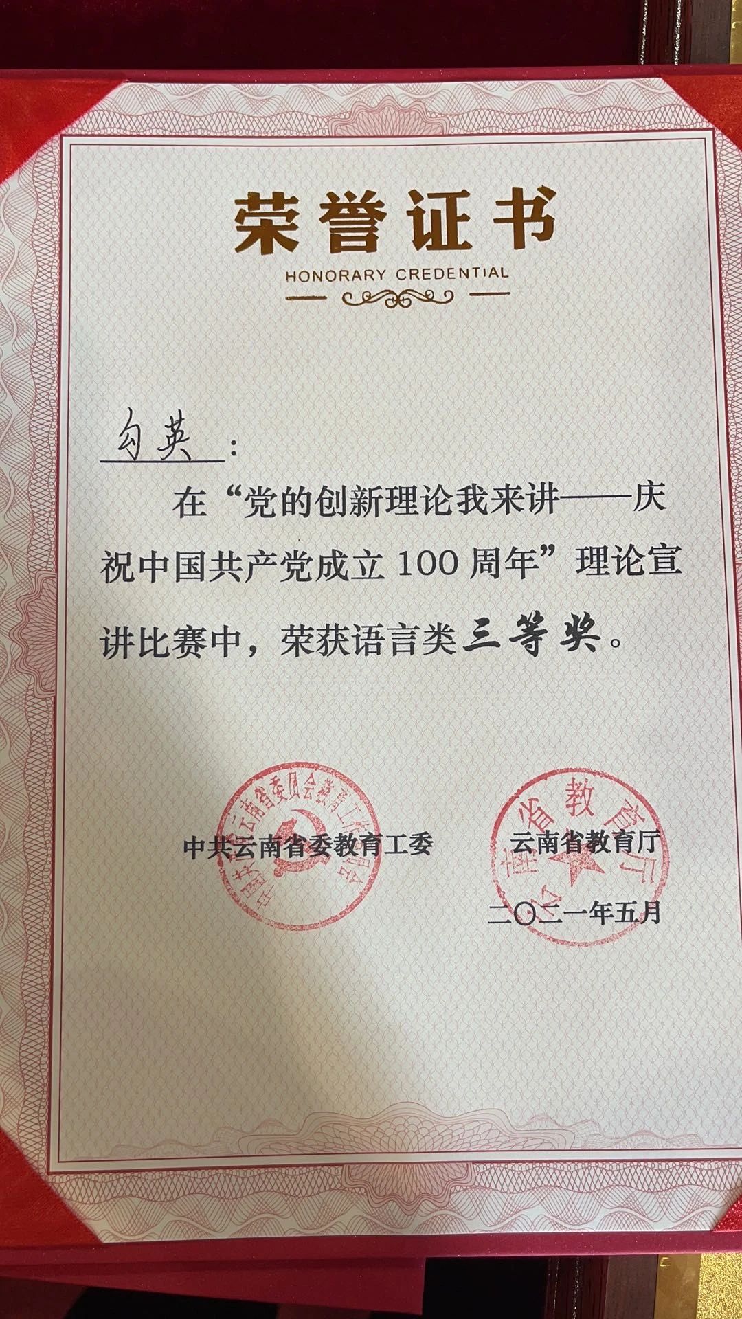 2021年5月25日,在省教育厅主办的“党的创新理论我来讲”比赛中,云工商获得3项奖