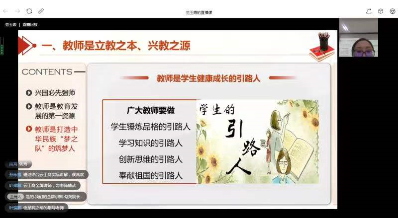 教育是承前启后的事业,教师的工作是继往开来的工作,教师是推动文化传承创新的中坚力量。云南工商学院作为应用型本科大学,教师在培养人才的过程中要结合学校特色、云南特色,加大对应用型、创新型人才的培养。所以,新教师在今后的发展中应注重纵横结合,不仅要将自己的知识传授给学生,同时也要积极做学生成长路上的引路人,成为“三全育人”的实践者。打造好高素质教师队伍,才能培养出高素质人才。教师在自身发展过程中,不仅要关注教学领域,同时也要提高科研水平。勾英副教授鼓励新教师,利用科研处提供的良好平台,在教改科研方面积极申报立项,把创新思想和首创精神融入教育教学改革中,以教学带动科研,以科反哺进教学。