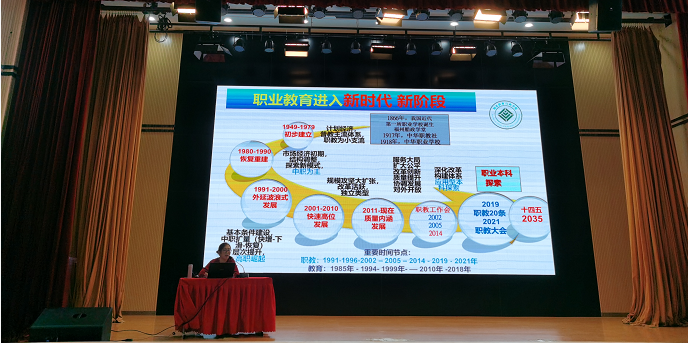 马克思主义学院勾英院长和任懿副教授作为特邀讲师参与授课。在授课中,勾英院长以现代职业教育进入新时代、新阶段为切入点,深刻地分析了从1866年第一所职业学校福州船政学堂诞生到职业教育初步建立、恢复重建、外延波浪式发展、快速高位发展、质量内涵发展的历史演变过程。她用丰富的教学资料,以极具亲和力的语言,结合自身教学实践,为远来的职业教师们传授了“真经”。