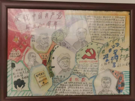 今天,让我们一起来欣赏绘画类作品,展览内容分别为:党史开篇总述、近代中国简述、五四学生爱国运动、红船精神、南昌起义、长征精神、党的七大、抗日战争胜利、新中国成立、抗美援朝战争、两弹一星、 改革开放、中国梦、习近平新时代中国特色社会主义思想、脱贫攻坚等,总共24个专题。作品由学生手工绘制,并镶有相框,陈列在致知楼1楼至5楼的走廊上,时间上由远及近,回顾中国共产党一百年的风雨历程。让师生沉浸在历史时光的长廊中不忘初心,让师生体会到我党艰苦创业的岁月里牢记使命,继而砥砺前行。