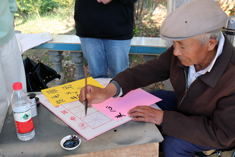 在一双双布满褶皱的手中道尽的全是对党、对祖国的热爱。老人们第一次在新时代接班人的热切关注中,自信的握着毛笔,用文字的方式倾诉自己对党和国家的感谢,对学生来说也是一次深刻的爱国教育。
