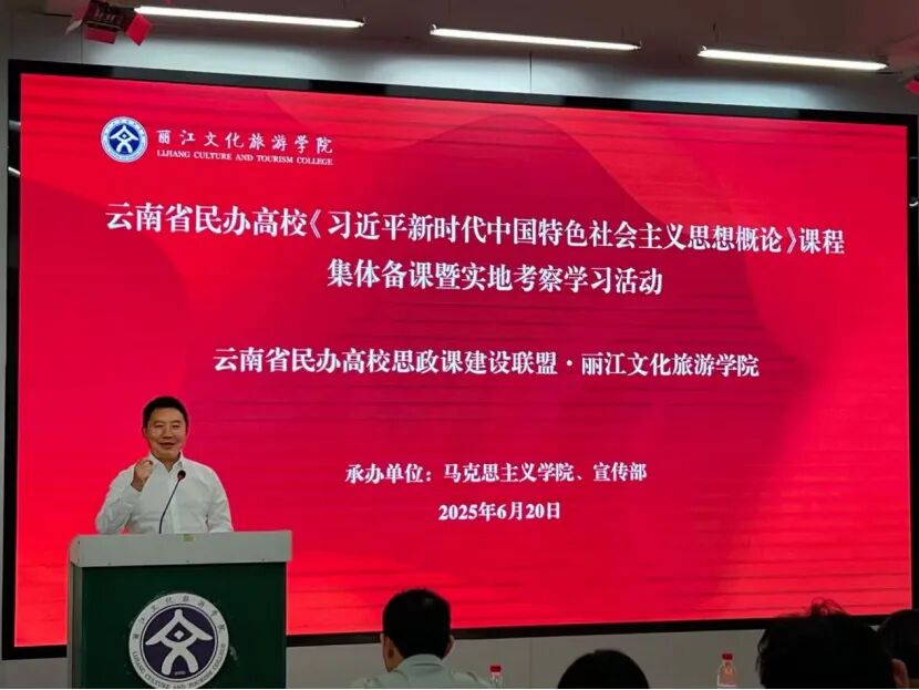 为持续深化习近平新时代中国特色社会主义思想学习教育,切实提升民办高校思想政治理论课教学质量,推动党的创新理论入脑入心,2025年6月20日,由云南省民办高校思政课建设联盟主办、丽江文化旅游学院承办的《习近平新时代中国特色社会主义思想概论》课程集体备课会在丽江举行。我院高度重视此次学习交流机会,由马克思主义学院院长勾英同志带队,组织教师代表参会。