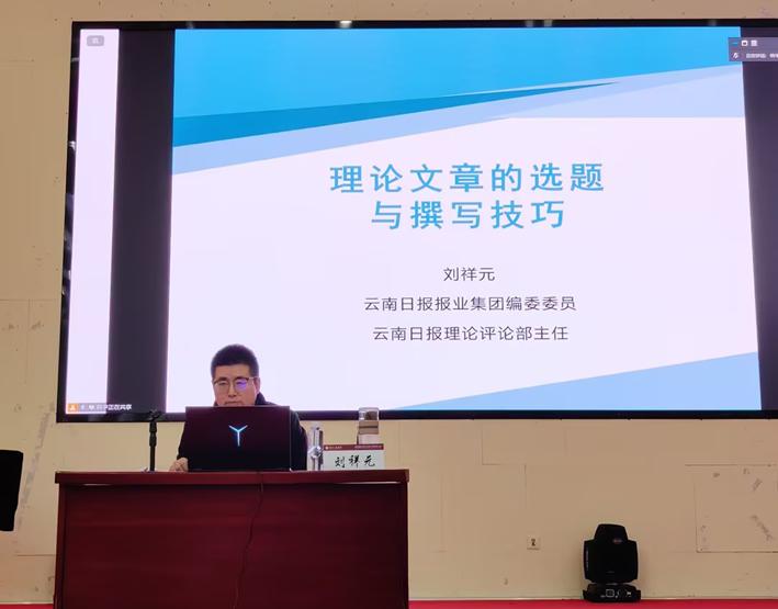 为深入学习贯彻习近平新时代中国特色社会主义思想,切实提升师生理论研究和学术写作能力,2025年9月17日,马克思主义学院特邀云南日报报业集团编委委员、理论评论部主任,《社会主义论坛》杂志主编,《融媒时代》执行主编刘祥元博士到校开展“理论文章的选题与撰写技巧”专题讲座。马克思主义学院、教育学院、文法学院教师代表参加学习。