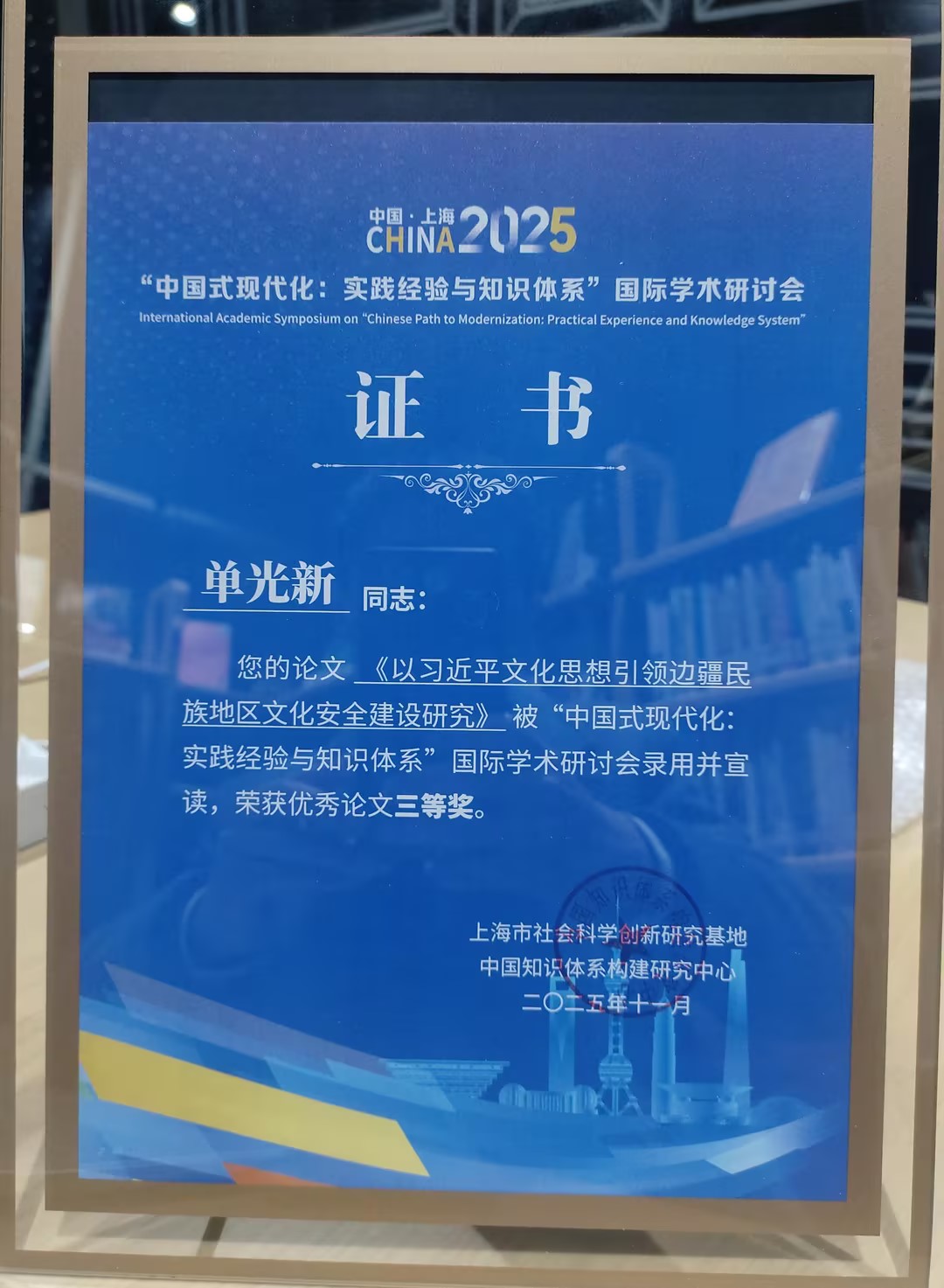 2025年11月21日至22日,“中国式现代化:实践经验与知识体系”国际学术研讨会在上海社会科学馆隆重举行。本次会议由上海市社会科学界联合会指导,上海立信会计金融学院与上海科学社会主义学会联合主办,多家单位共同承办。来自复旦大学、华东师范大学、上海交通大学、同济大学、中国人民大学、重庆大学、上海大学,以及捷克科学院哲学研究所、英国诺丁汉大学等30余所国内外高校与研究机构的专家学者、优秀论文作者和师生代表参会,围绕中国式现代化的理论逻辑、实践经验与知识体系展开深入交流。我院单光新老师作为优秀论文作者受邀参会,并在分论坛作交流发言。
