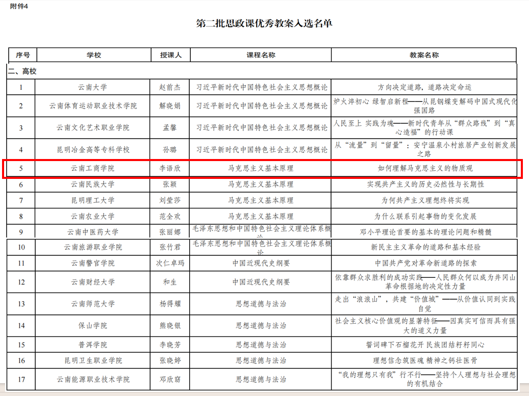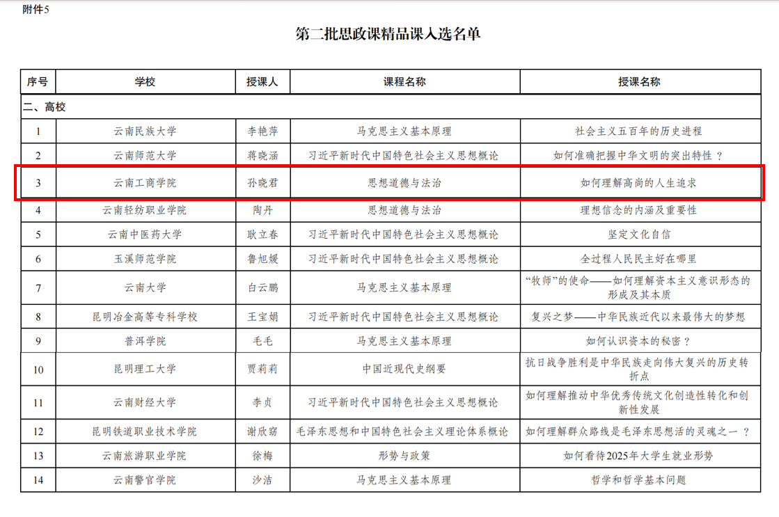 近日,中共云南省委教育工委公布第二批云南省大中小学思想政治教育一体化建设项目入选名单。我校马克思主义学院孙晓君老师申报的精品课程与李语欣老师申报的优秀教案双双入选。这是学院在教学科研领域取得的又一重要成果。